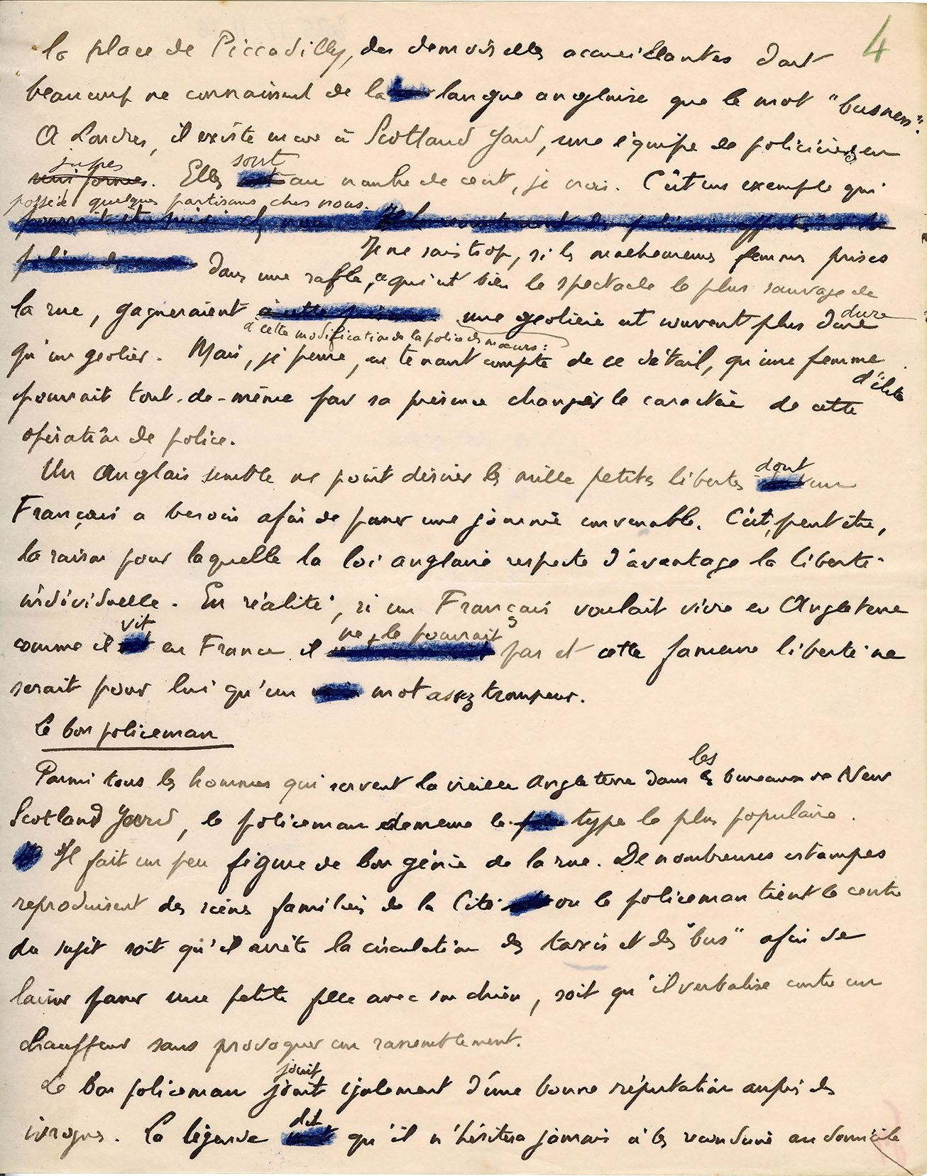 À Londres, il existe encore à Scotland Yard, une équipe de policières en jupes. Elles sont au nombre de cent, je crois. C’est un exemple qui possède quelques partisans chez nous. Je ne sais trop si les malheureuses femmes prises dans une rafle, ce qui est bien le spectacle le plus sauvage de la rue, gagneraient à cette modification de la police des mœurs : une geôlière est souvent plus dure qu’un geôlier. Mais, je pense, en tenant compte de ce détail, qu’une femme d’élite pourrait tout de même par sa présence changer le caractère de cette opération de police.