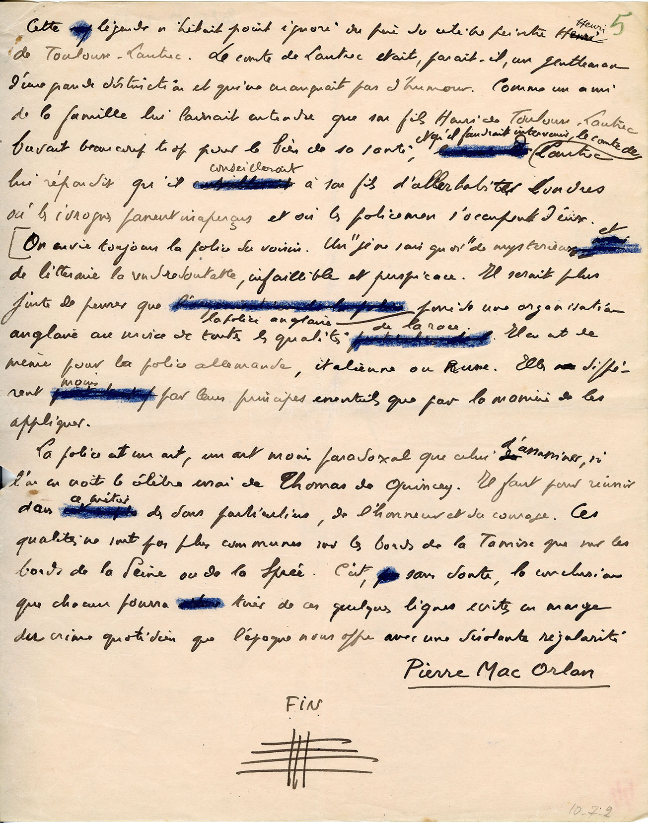 Il n’est pas fréquent qu’un reporter en service commandé soit assassiné au cours d’une enquête menée dans les milieux fréquentés par la plus basse pègre d’une ville réputée pour dangereuse. Je ne connais qu’un exemple : Il y a quelques années, un journaliste étranger au pays fut assassiné à Berlin dans la Mulackstraβe par une femme de la rue. Le journalisme n’exige pas de tels sacrifices. Faire une enquête afin d’essayer de mettre simplement au point la valeur d’une police, qu’elle soit britannique, française ou allemande, m’apparaît comme une œuvre fragile, tout à fait provisoire.