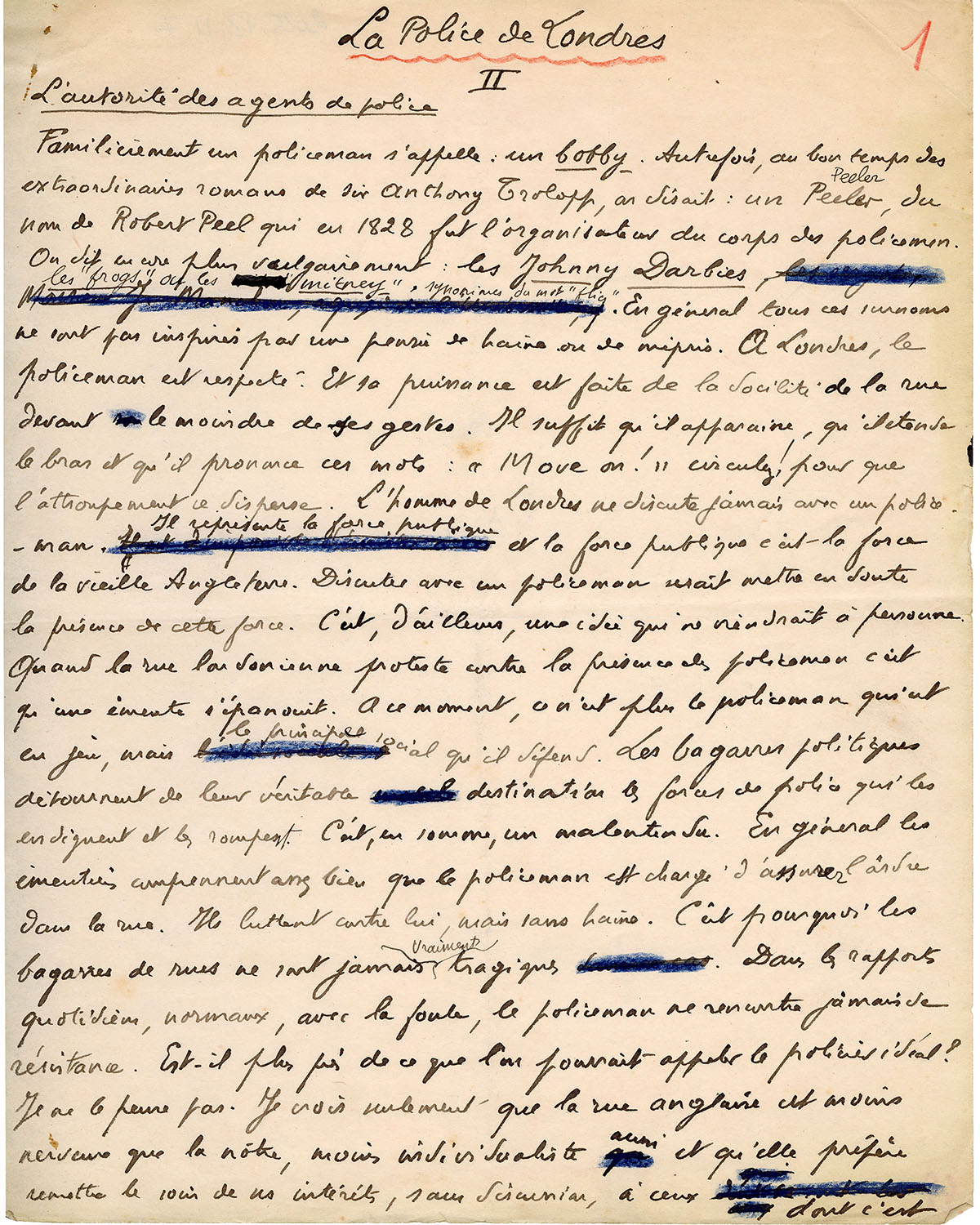 Manuscrit d'un reportage sur la police de Londres. Ce reportage a été repris dans "Images sur la Tamise" (1925). Il est divisé en 4 parties :