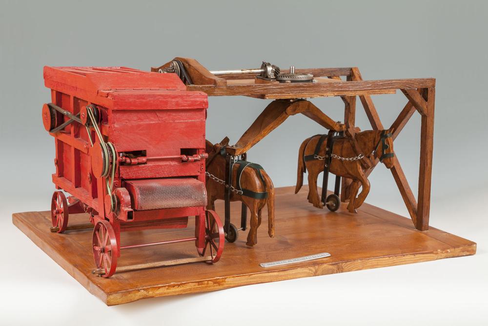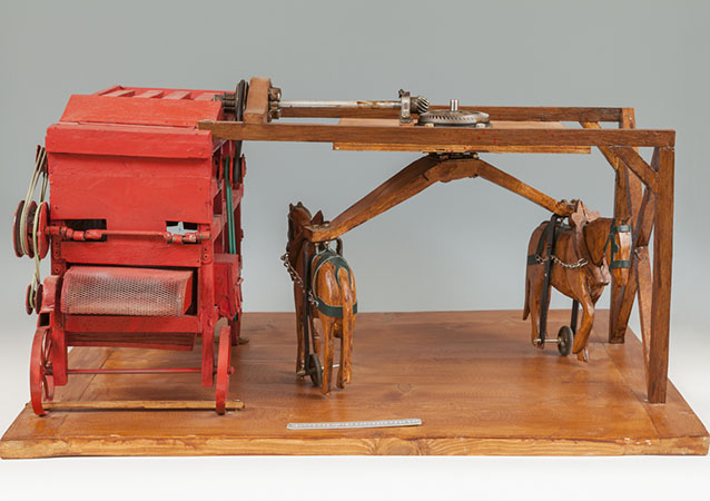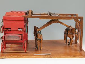Maquette d'une batteuse à manège, utilisée avant la Seconde Guerre mondiale, à la ferme de Pouilly-Gallerand, commune de Saint-Germain-Laxis.