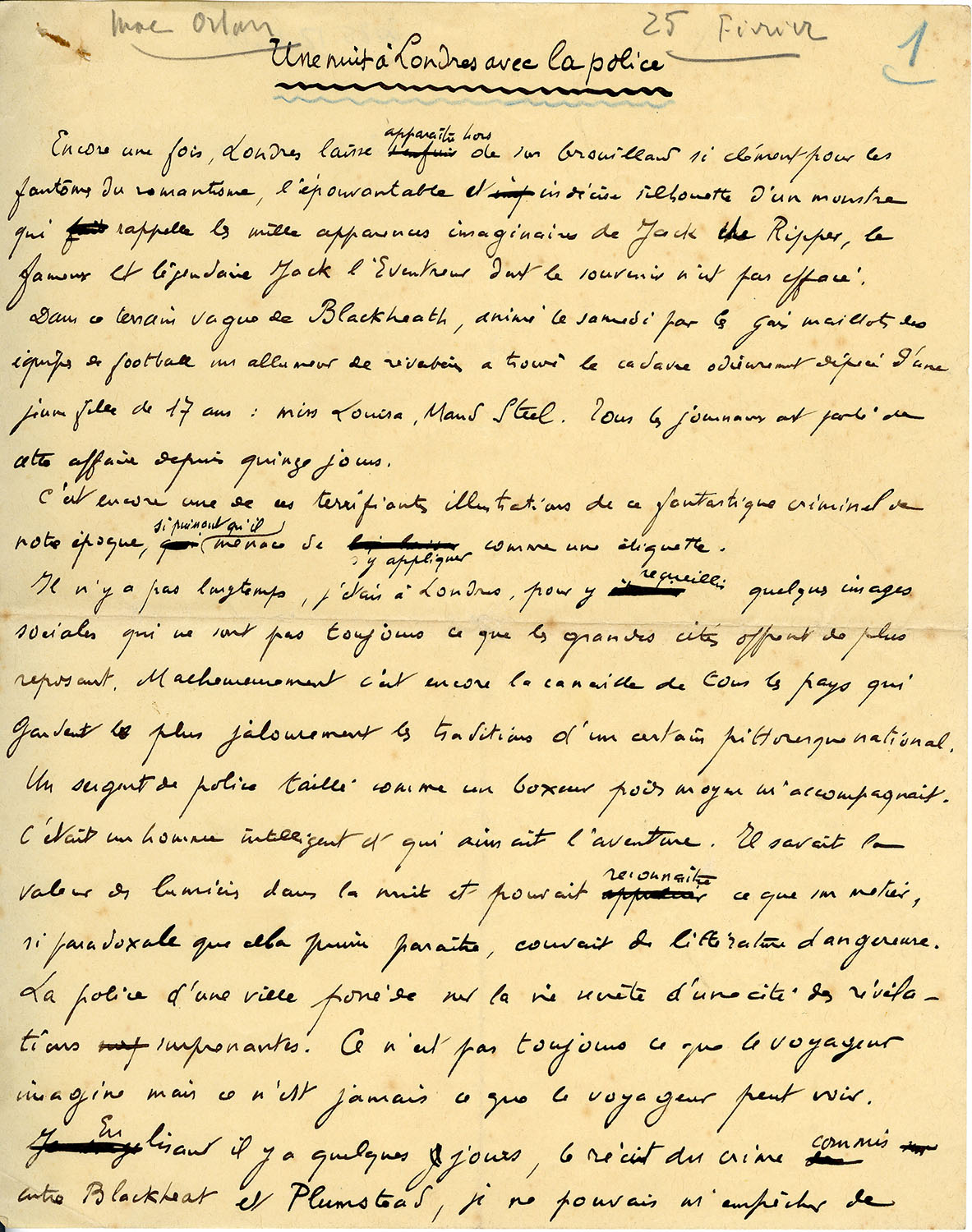 Il n’y a pas longtemps, j’étais à Londres, pour y recueillir quelques images sociales qui ne sont pas toujours ce que les grandes cités offrent de plus reposant. Malheureusement c’est encore la canaille de tous le qui garde le plus jalousement les traditions d’un certain pittoresque national. Un sergent de police taillé comme un boxeur poids moyen m’accompagnait. C’était un homme intelligent et qui aimait l’aventure. Il savait la valeur des lumières dans la nuit et pouvait reconnaître ce que son métier, si paradoxal que cela puisse paraître, couvait de littérature dangereuse. La police d’une ville possède sur la vie secrète d’une cité des révélations surprenantes. Ce n’est pas toujours ce que le voyageur imagine mais ce n’est jamais ce que le voyageur peut voir.