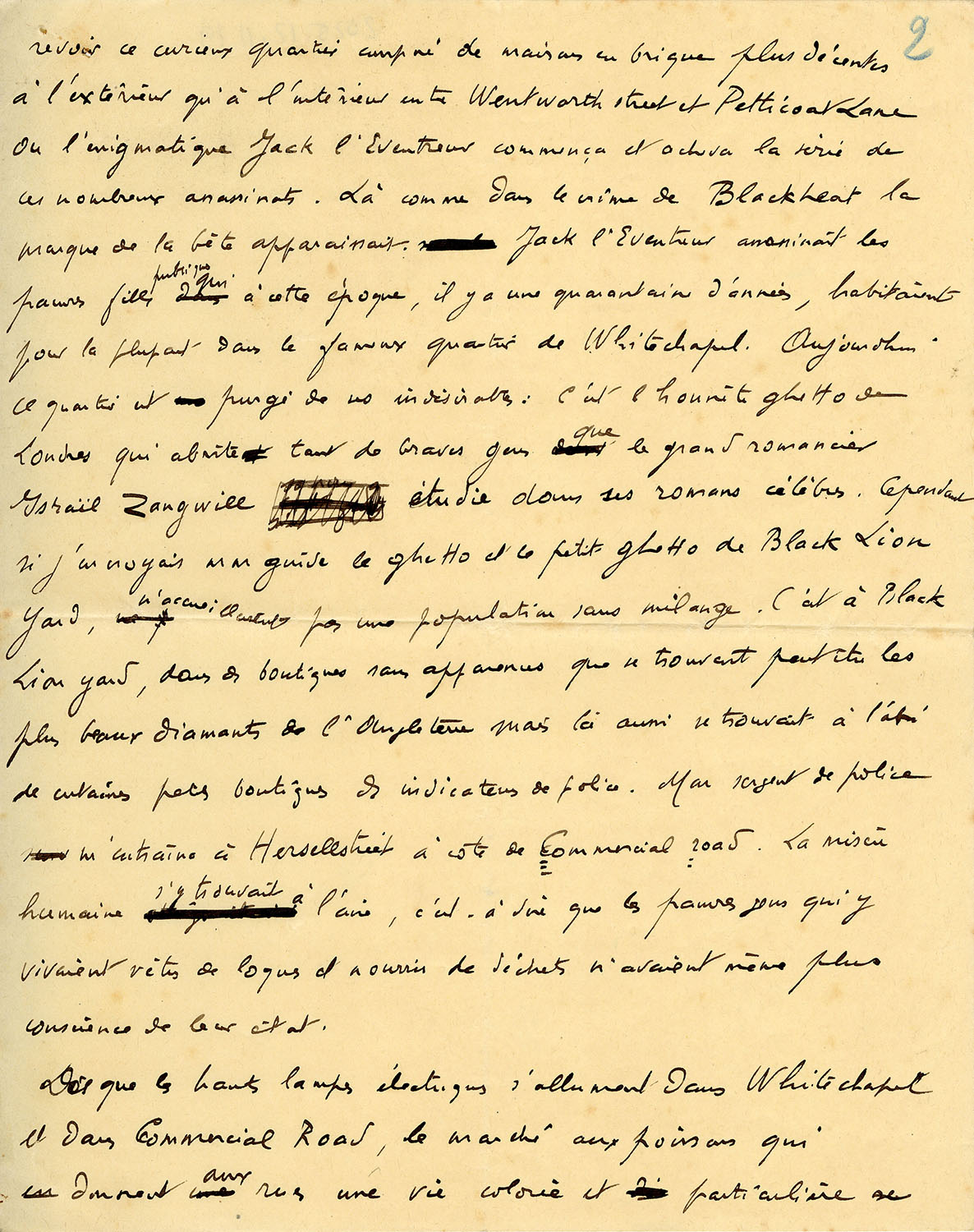 En lisant il y a quelques jours, le récit du crime commis entre Blackheath et Plumstead, je ne pouvais m’empêcher de revoir ce curieux quartier composé de maisons en briques, plus décentes à l’extérieur qu’à l’intérieur entre Wentworth Street et Petticoat Lane, où Jack l’Éventreur commença et acheva la série de ses nombreux assassinats. Là, comme dans le crime de Blackheath, la marque de la bête apparaissait : Jack l’Éventreur assassinait les pauvres filles publiques qui à cette époque, il y a une quarantaine d’années, habitaient pour la plupart dans le fameux quartier de Whitechapel. Aujourd’hui ce quartier est purgé de ses indésirables : c’est l’honnête ghetto de Londres, qui abrite tant de braves gens que le grand romancier Israël Zangwill étudie dans ses romans célèbres. Cependant si j’en croyais mon guide, le ghetto et le petit ghetto de Black Lion Yard, n’accueilleraient pas une population sans mélange. C’est à Black Lion Yard, dans des boutiques sans apparences que se trouvent peut-être les plus diamants de l’Angleterre, mais là aussi se trouvaient, à l’abri de certaines petites boutiques, des indicateurs de police. Mon sergent de police m’entraîna à Hersellstreet* à côté de Commercial Road. La misère humaine s’y trouvait à l’aise, c’est-à-dire que les pauvres gans qui y vivaient vêtus de loques et nourris de déchets n’avaient même plus conscience de leur état.