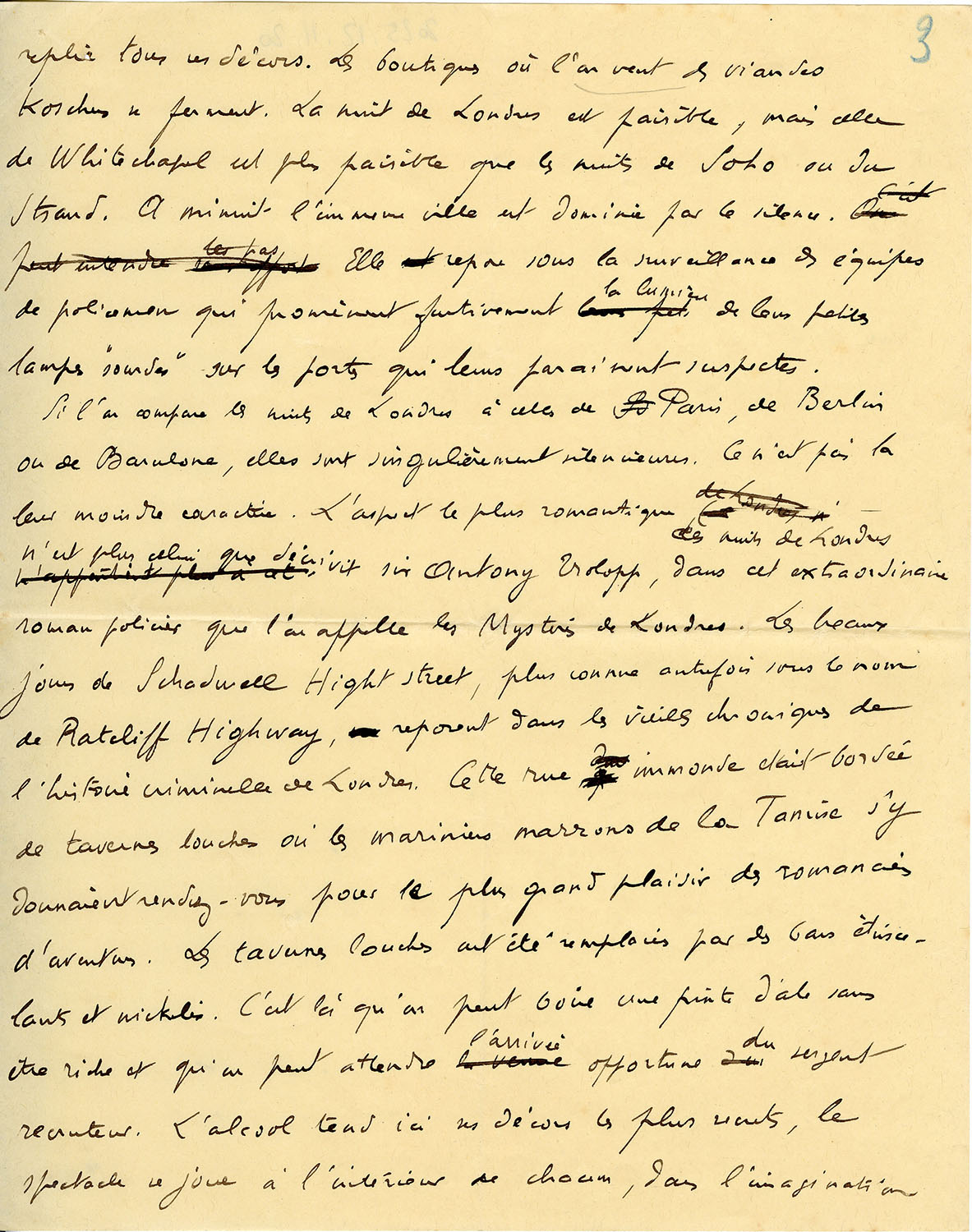 Si l’on compare les nuits de Londres à celles de Paris, de Berlin ou de Barcelone, elles sont singulièrement silencieuses. Ce n’est pas là leur moindre caractère. L’aspect le plus romantique des nuits de Londres n’est plus celui que décrivit Sir Anthony Trollope, dans cet extraordinaire roman policier que l’on appelle « Les Mystères de Londres ». Les beaux jours de Shadwell High Street, plus connue autrefois de Ratcliff Highway, reposent dans les vieilles chroniques de l’histoire criminelle de Londres. Cette rue immonde était bordée de tavernes louches où les mariniers marrons de la Tamise s’y donnaient rendez-vous pour le plus grand plaisir des romanciers d’aventures. Les tavernes louches ont été remplacées par des bars étincelants et nickelés. C’est là qu’on peut boire une pinte d’ale sans être riche et qu’on peut attendre l’arrivée opportune du sergent recruteur. L’alcool tend ici ses décors les plus secrets, le spectacle se joue à l’intérieur de chacun, dans l’imagination de ces pauvres hommes, de ces pauvres femmes qui s’en vont dans la rue trop éclairée, la longue et large Commercial Road. Ils ont l’allure furtive des rats quand ils se trouvent surpris dans une nappe de lumière.