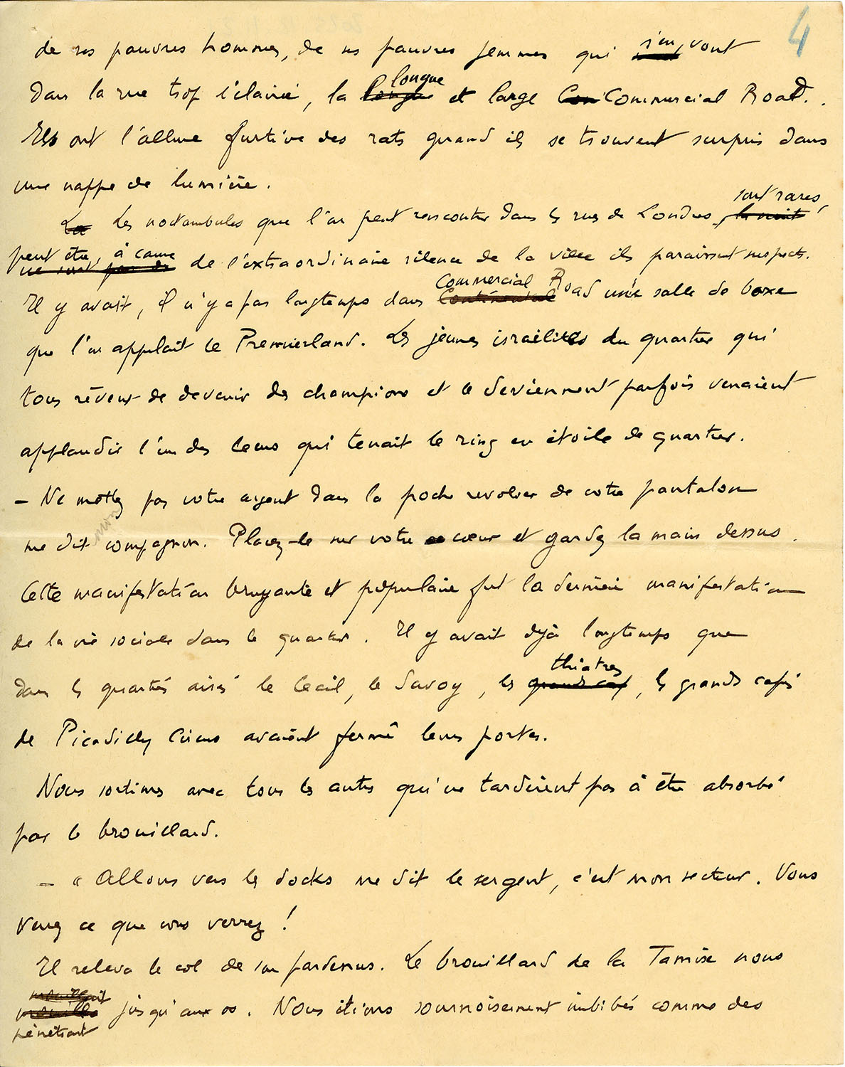 Les noctambules que l’on peut rencontrer dans les rues de Londres sont rares, peut-être, à cause de l’extraordinaire silence de la ville ils paraissent suspects. Il y avait, il n’y a pas longtemps dans Commercial Road une salle de boxe que l’on appelait le Prennierland*. Les jeunes israélites du quartier qui tous rêvent de devenir des champions et le deviennent parfois venaient applaudir l’un des leurs qui tenait le ring en étoile de quartier.