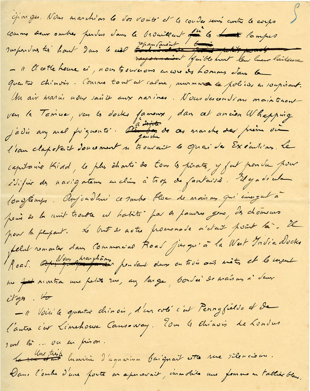 Quand nous sortîmes de Pennyfields le petit jour se levait. Nous rencontrâmes une ronde de police et le chauffeur chinois coiffé de casquette blanche de marine. Le brouillard tombait en pluie, ; sur la Tamise des sirènes endormies saluaient l’aube, les départs, la possibilité d’une autre lumière…