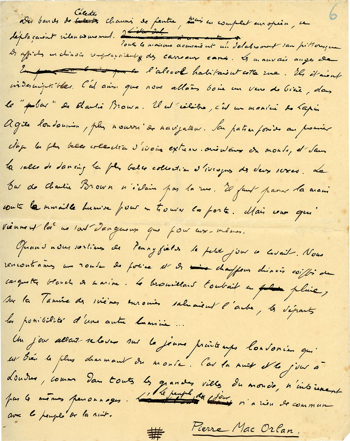Des bandes de Célestes, chaussés de feutre, mais en complet européen, se déplaçaient silencieusement. Toutes les maisons accusaient un délabrement sans pittoresque. Des affiches en chinois remplaçaient des carreaux cassés. Les mauvais anges de l’alcool habitaient cette rue. Ils étaient indescriptibles. C’est ainsi que nous allâmes boire un verre de bière, dans le « bar » de Charlie Brown. Il est célèbre, c’est une manière de Lapin Agile londonien, plus nourri de navigateurs. Son patron possède au premier étage la plus belle collection d’ivoires extrême-orientaux du monde, et dans la salle de dancing, la plus belle collection d’ivrognes des deux sexes. Le bar de Charlie Brown n’éclaire pas la rue. Il faut passer la main contre la muraille humide pour en trouver la porte. Mais ceux qui viennent là ne sont dangereux que pour eux-mêmes.